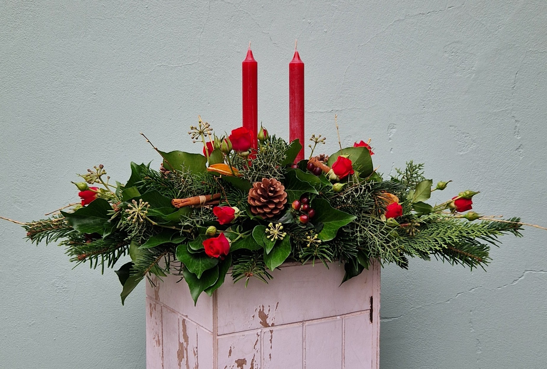 A beautiful, elegant arrangement with two red, tapered candles, including cones, orange slices, cinnamon, berries and red roses. The perfect centerpiece for your Christmas table or mantlepiece.